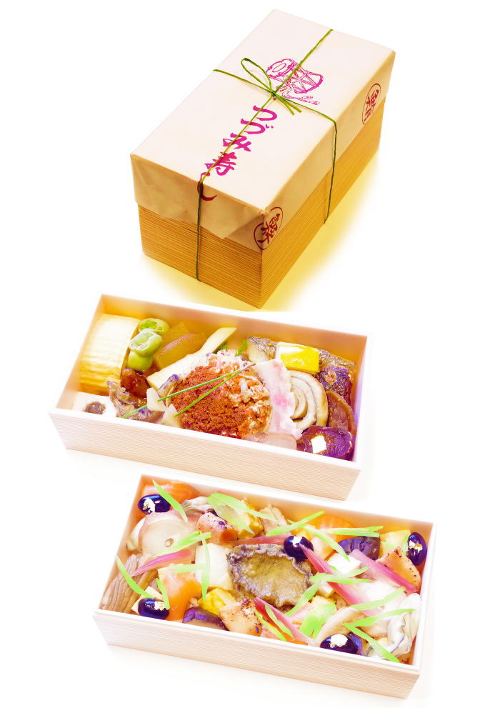 旬の魚介類や野菜を盛り込んだ二段重ねのお